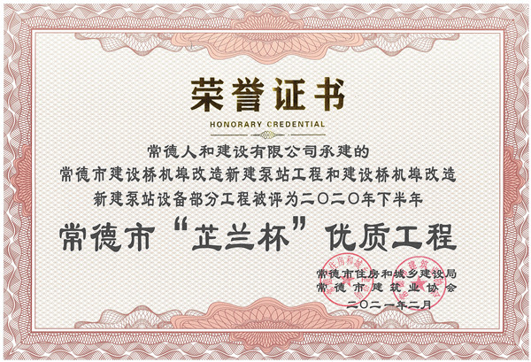 常德市建設(shè)橋機埠改造新建泵站工程和建設(shè)橋機埠改造新建泵站設(shè)備部分工程被評為2020年下半年常德市“芷蘭杯”優(yōu)質(zhì)工程